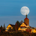 Die Mondbilder sind ein Spiel mit langen Brennweiten, also mit einem Teleobjektiv ab 500 mm. Durch die optische Kompression wirkt der Mond hinter einem irdischen Objekt überproportional groß.